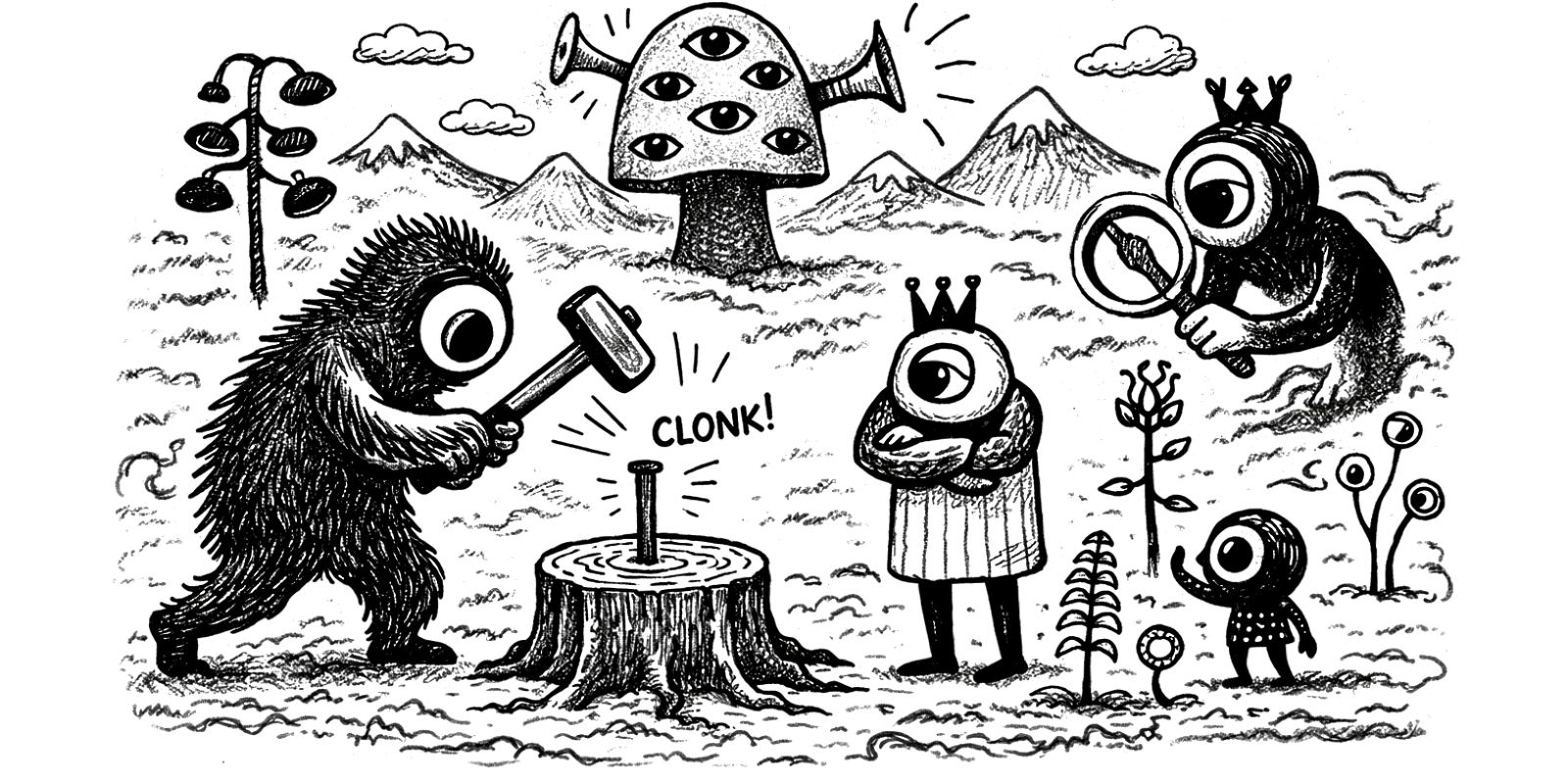 Players take turns striking a nail into a wooden stump.